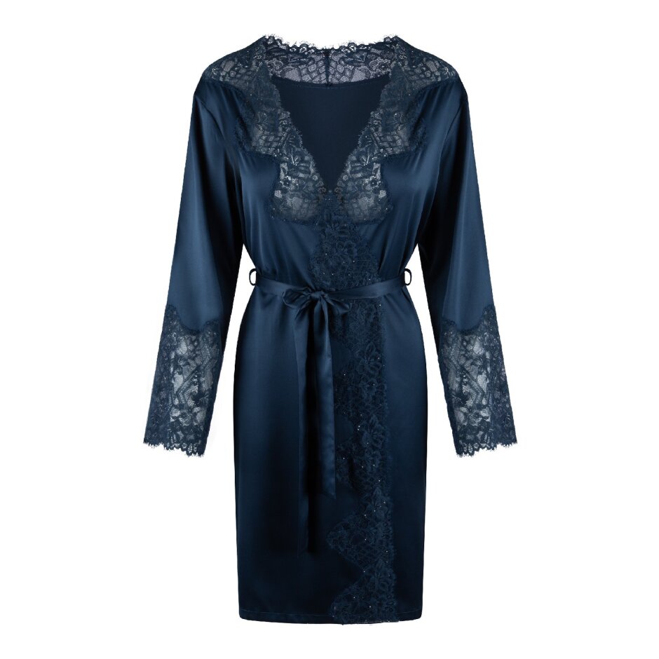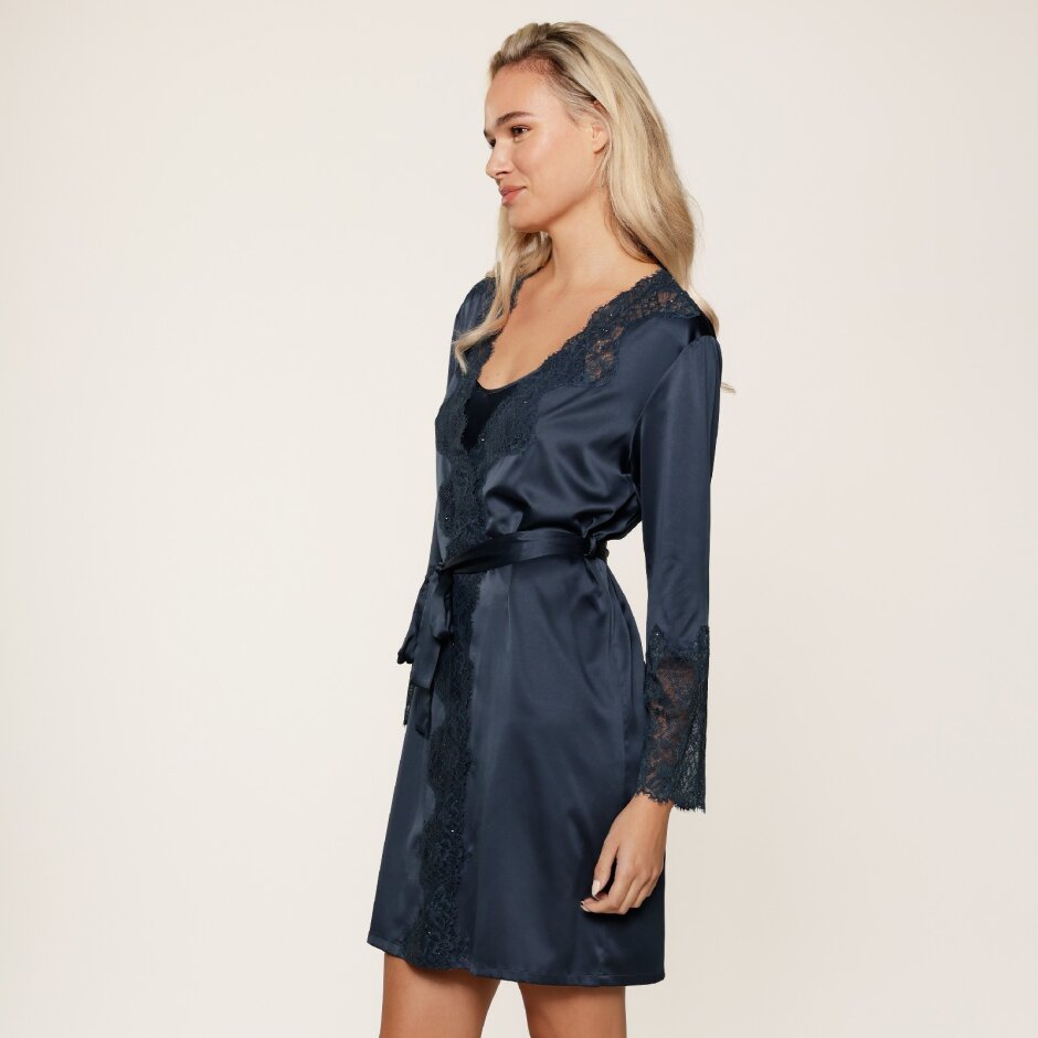 Upptäck LingaDore Satin Kimono Midnight i en glittrande blå nyans, där mjuk satin möter delikata spetsdetaljer längs kanter och ärmar. Kimonon kan knytas på insidan med ett litet snöre och dras åt i midjan med det matchande skärpet, vilket ger en perfekt passform och ett elegant fall.