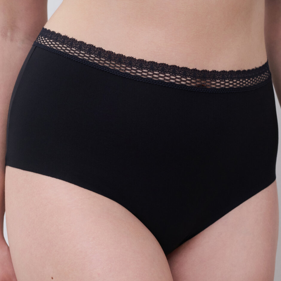 Trosan är högmidjad och täcker mage och bakdel, tillverkad i mjukt modalmaterial med delikata återvunna spetsdetaljer som ger ett sofistikerat touch. Finns i storlekar S, M, L och XL, och de rena skären gör trosan helt osynlig under kläder.